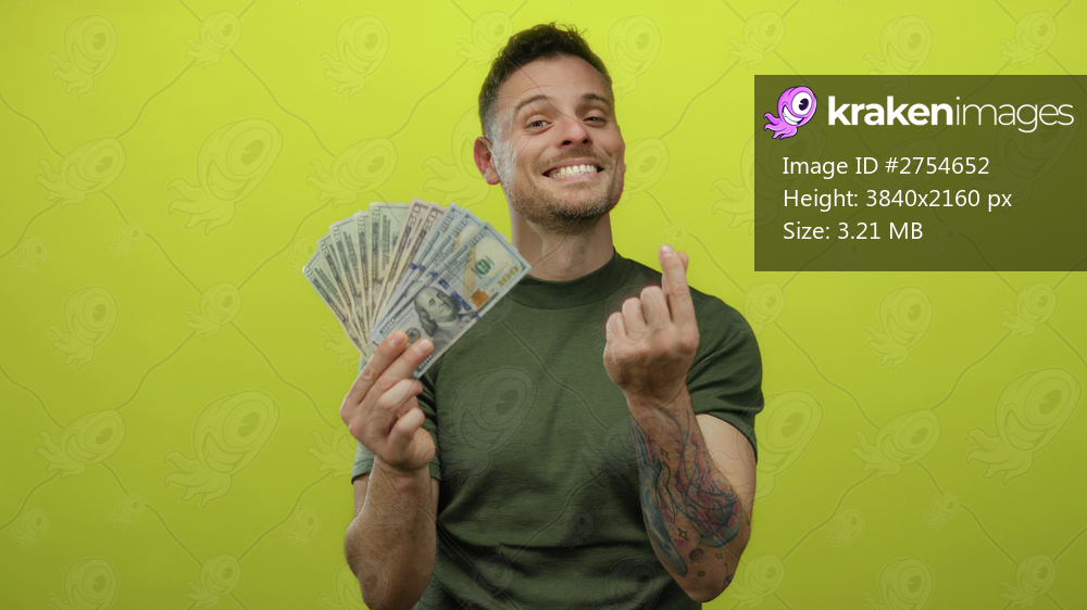Hispanic man holding fan of dollars smiles confidently against a vivid yellow background exuding charisma and financial success while making a playful finger heart gesture. - Kraken Images