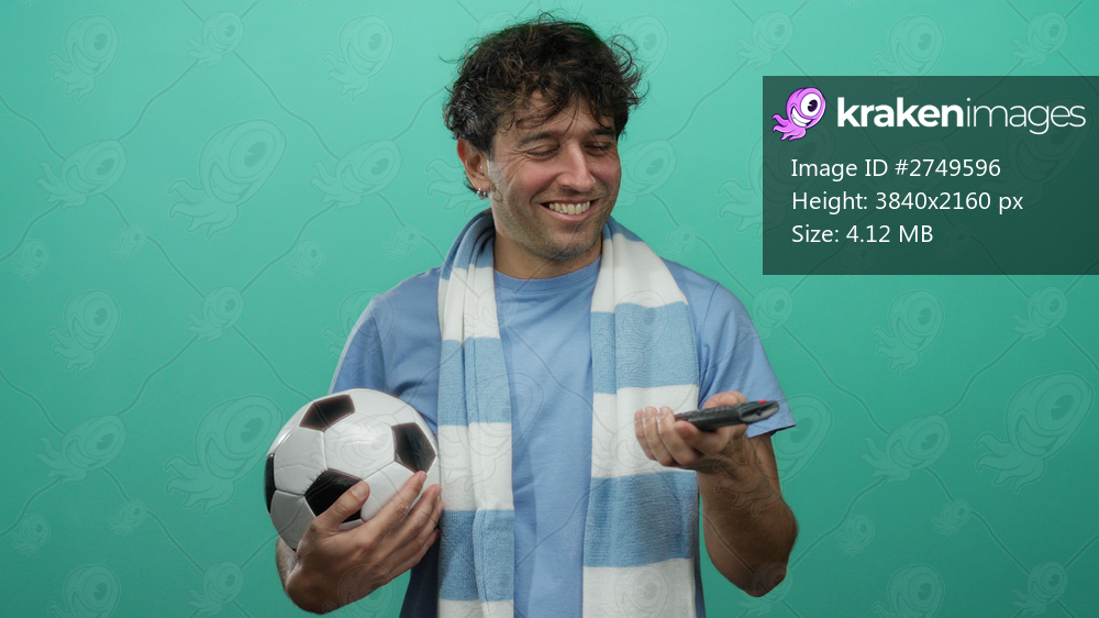 Hispanic man holding football and remote on green background, smiling enthusiastically, capturing the essence of sports fandom and leisure.