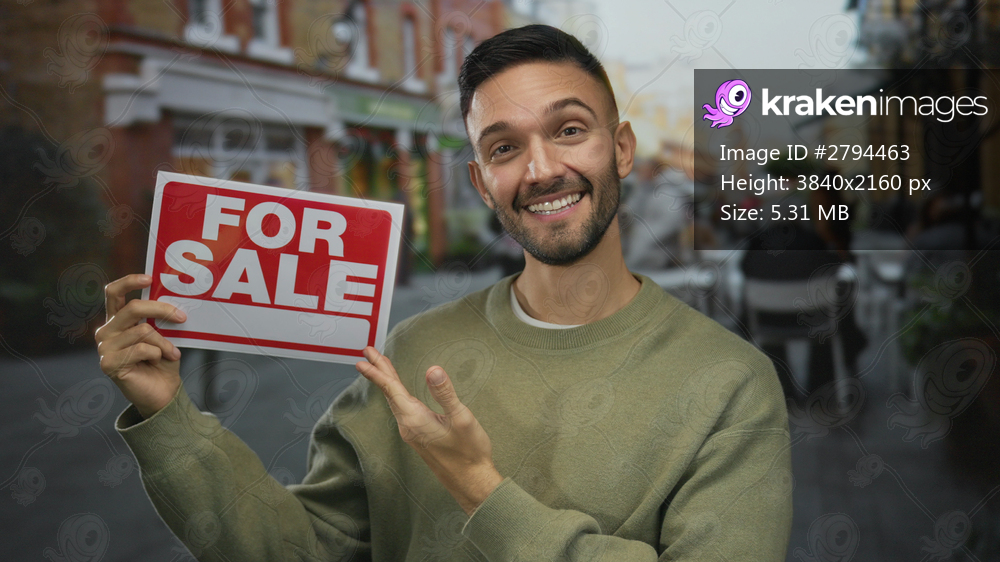 Hispanic man holding for sale sign smiles confidently on urban street with blurred cityscape background suggesting real estate opportunity