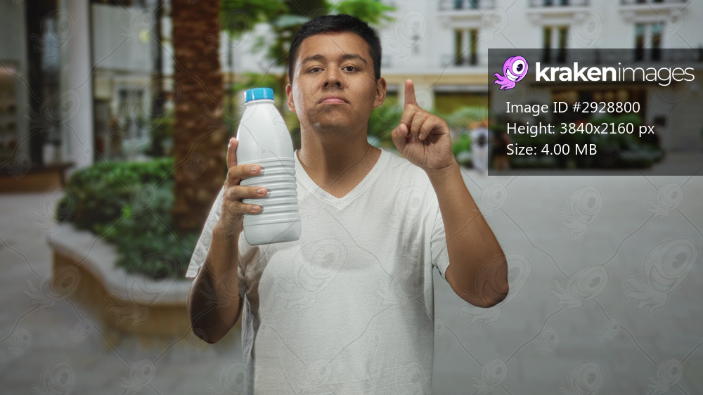 Hispanic man holding large plastic bottle and pointing index finger in street by building planter; product promotion confidence.