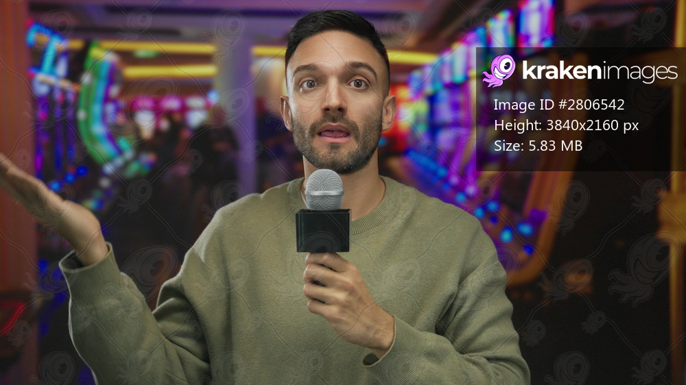 Hispanic man holding microphone in casino setting with colorful slot machines in background during indoor interview