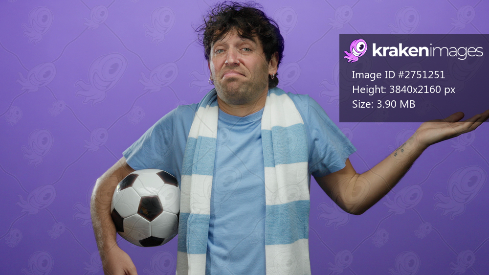 Hispanic man holding soccer ball with a puzzled expression against a vibrant purple background, embodying sports enthusiasm and handsome confidence.