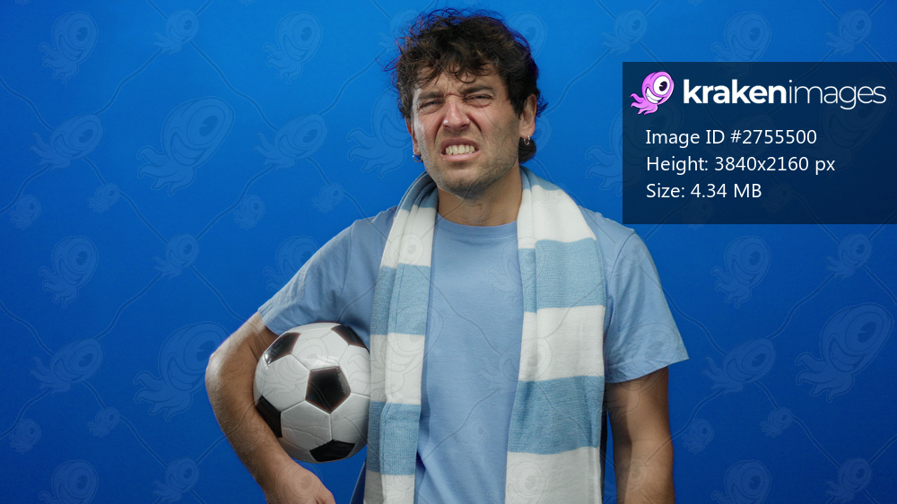 Hispanic man holding soccer ball with displeased expression wearing blue shirt and scarf against blue background, showing a mix of frustration and hesitation in a sporty context. - Kraken Images