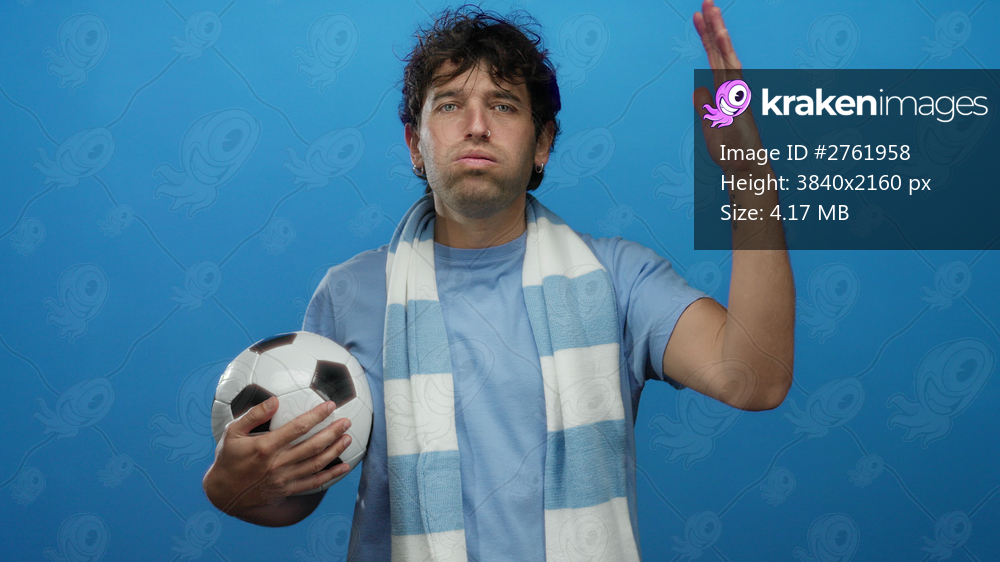 Hispanic man holding soccer ball wearing blue scarf with determined expression against solid blue background depicting sports enthusiasm.