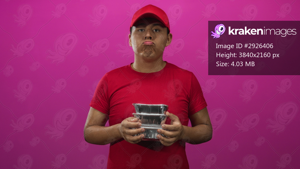 Hispanic man holding stacked aluminum food containers in studio against pink backdrop; duty perseverance service.