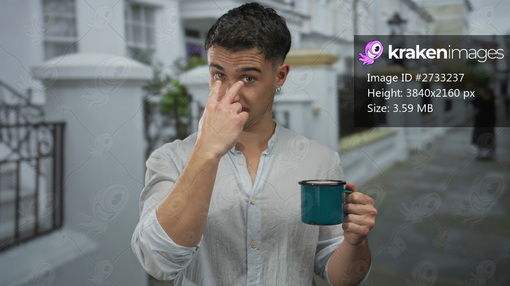 Hispanic man holds a coffee cup on a city street while making the watching you gesture, conveying a humorous and casual urban scene of observation and coffee culture.