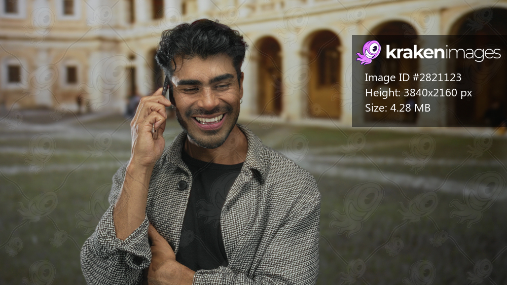 Hispanic man holds smartphone to ear in front of historic university building; cheerful social connection.