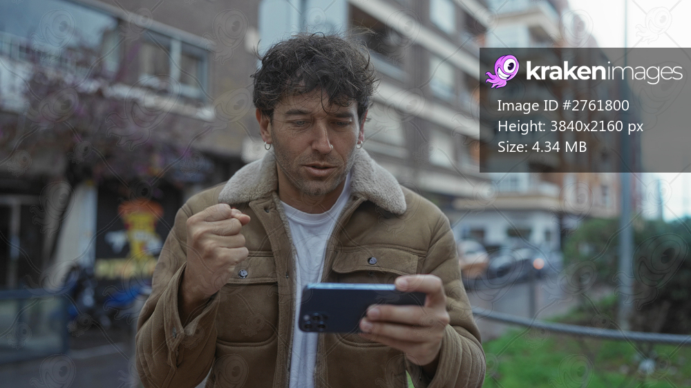 Hispanic man in a brown jacket looks intently at smartphone on a city street with modern buildings in the background, showcasing urban lifestyle and technology. - Kraken Images