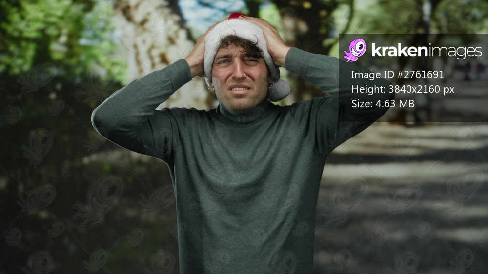 Hispanic man in a christmas hat looking distressed stands in a sun-dappled park, surrounded by green trees, capturing both holiday spirit and emotion.