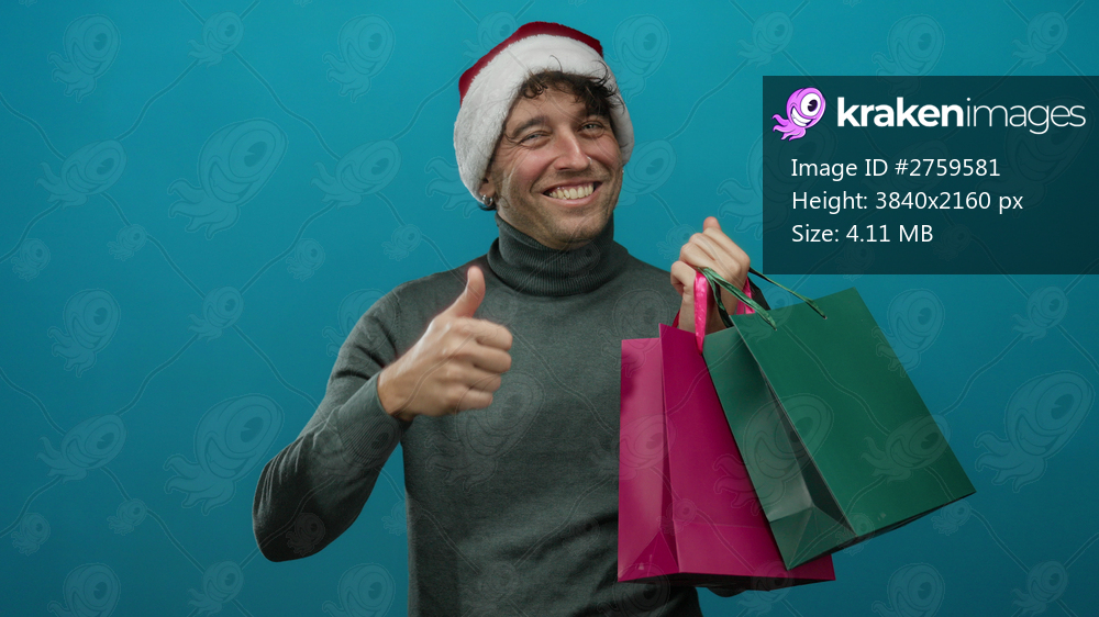 Hispanic man in a christmas hat smiles holding shopping bags against a blue background, conveying festive joy and holiday preparations.