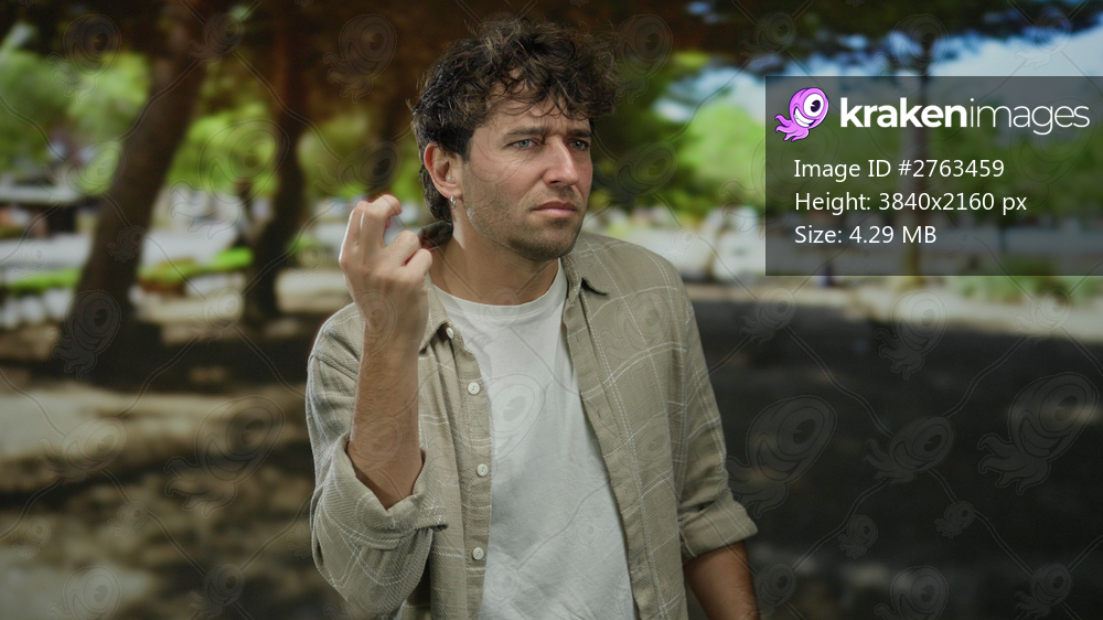 Hispanic man in a park standing thoughtfully, surrounded by lush greenery and sunlight filtering through trees, dressed casually in neutral tones.