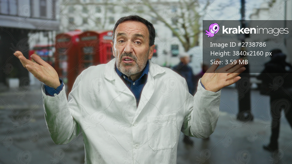 Hispanic man in a white coat stands on a london street with iconic red phone booths in the background, expressing confusion.
