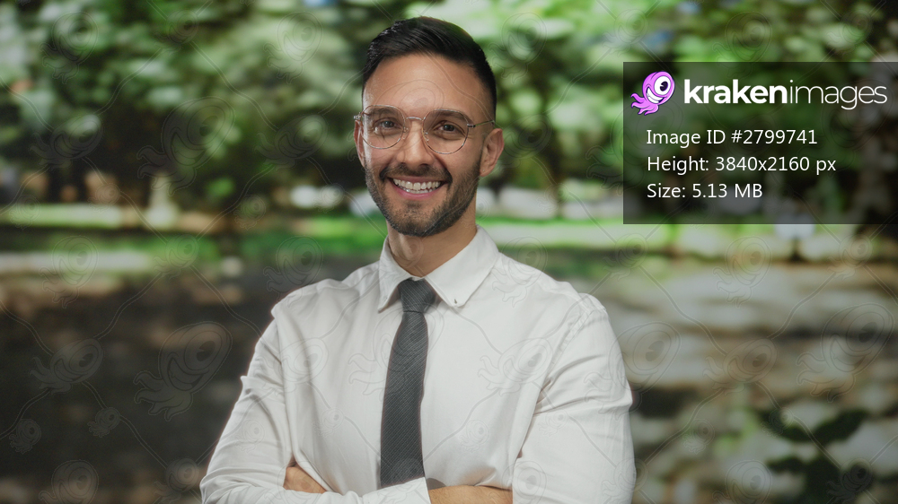 Hispanic man in a white shirt crosses his arms while smiling confidently in a lush green park setting, capturing a blend of professionalism and relaxation in the outdoors. - Kraken Images