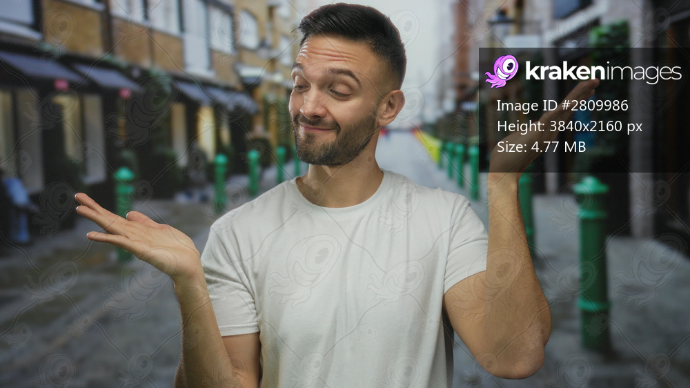 Hispanic man in a white shirt with hands extended on an urban city street showing indecision and friendly demeanor outdoors.