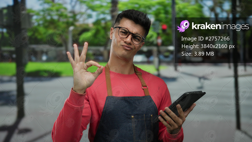 Hispanic man in apron using tablet on city street communicates approval with ok sign surrounded by vibrant outdoor scenery.