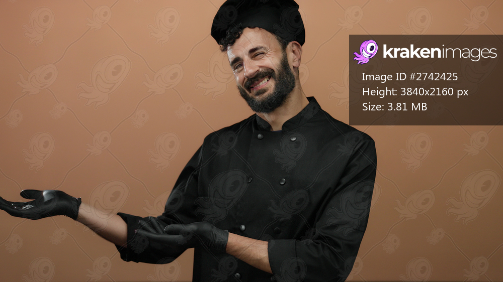 Hispanic man in black chef uniform with a beard extends hands presenting something against an orange background, capturing culinary expertise and hospitality with a welcoming gesture. - Kraken Images