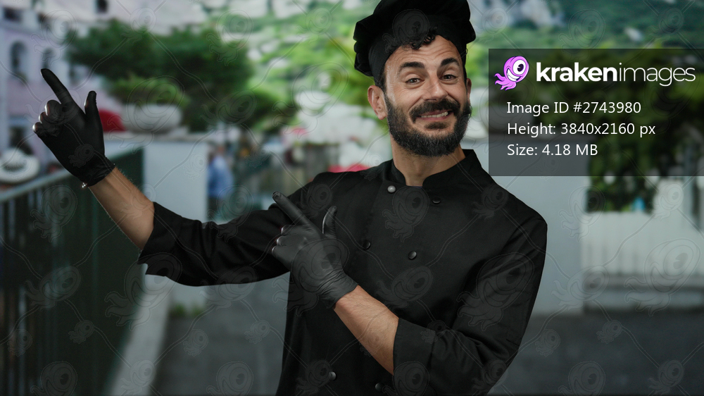 Hispanic man in black chef uniform and hat with beard points happily on a vibrant outdoor street background, engaging and inviting.