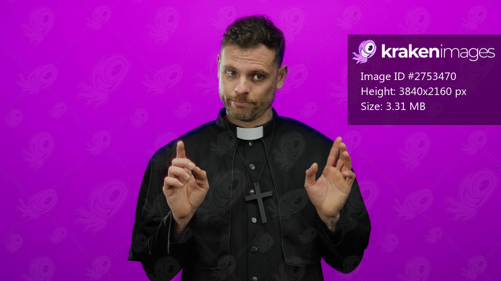 Hispanic man in black clergy attire standing isolated against pink background, expressing denial with hand gestures.