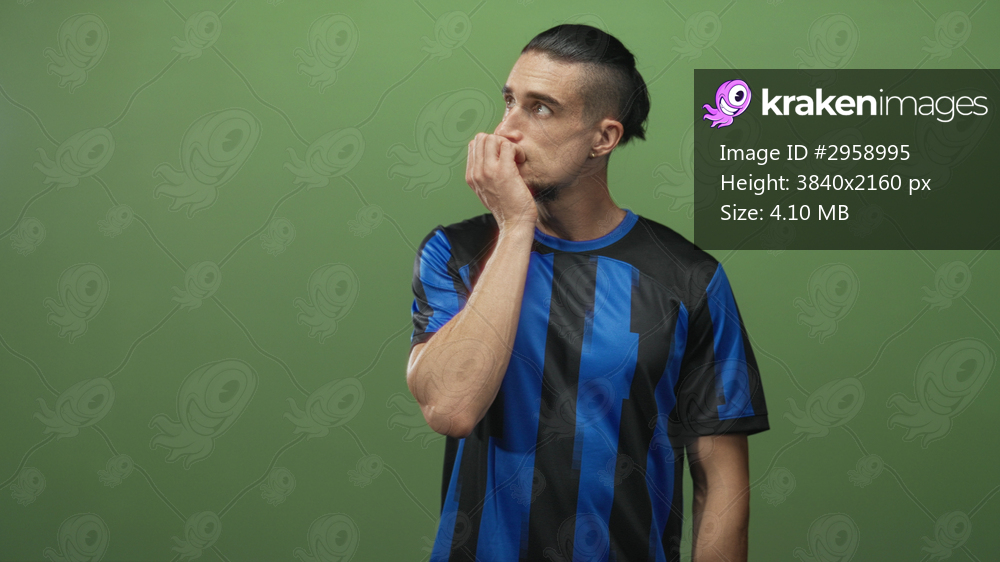 Hispanic man in blue and black soccer jersey biting fingernail with hand near mouth in studio; anxious reflection.