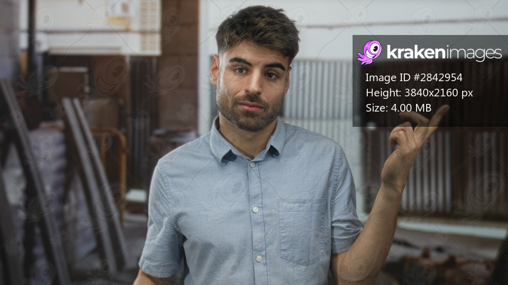 Hispanic man in blue shirt flicks finger amid scaffolding inside building with neutral expression; apathy.