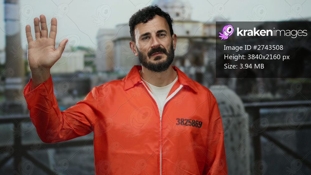 Hispanic man in bright prison jumpsuit stands with raised hand against ancient rome backdrop, conveying themes of imprisonment and cultural juxtaposition. - Kraken Images