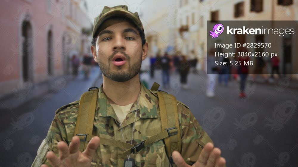 Hispanic man in camouflage combat uniform with dog tags raising palms forward on busy street; caution.