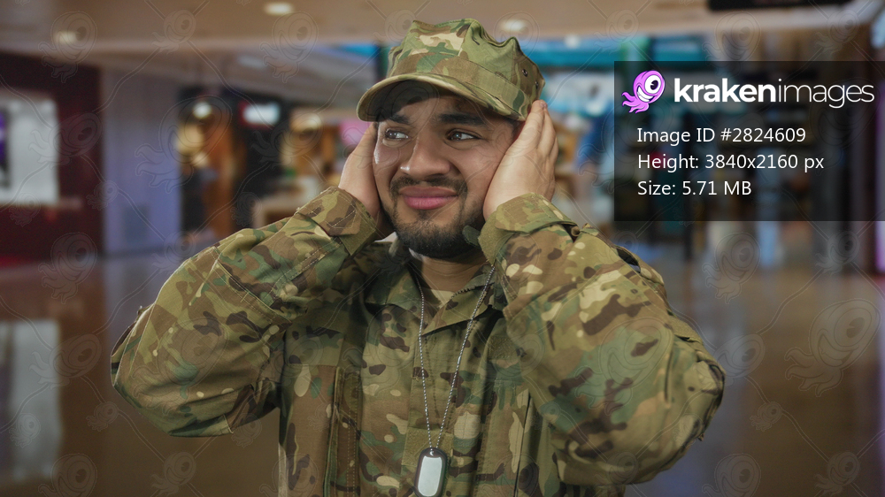 Hispanic man in camouflage uniform covers ears with both hands amid crowded shopping mall building; discomfort.