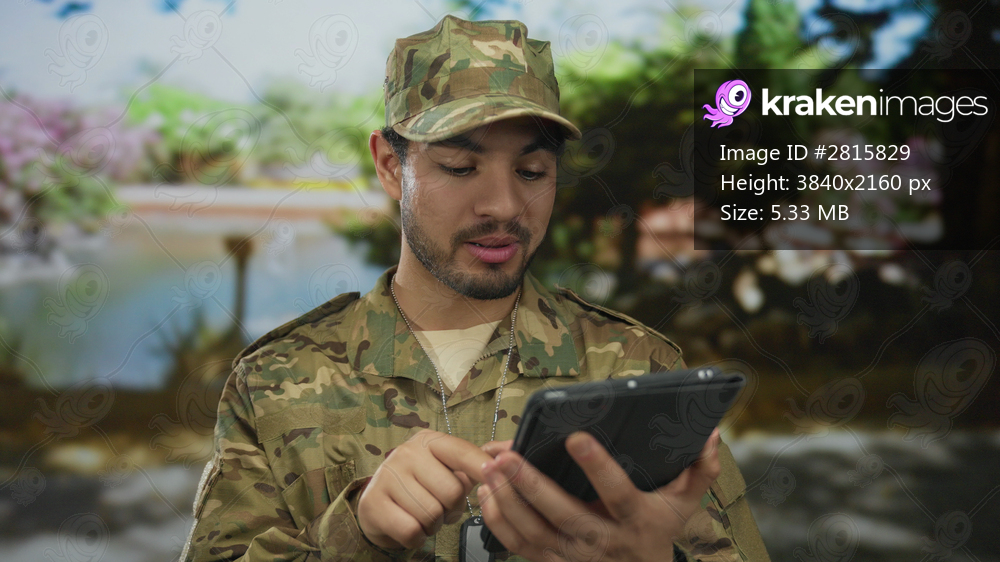 Hispanic man in camouflage uniform holds tablet and points finger to screen in green park; concentration.