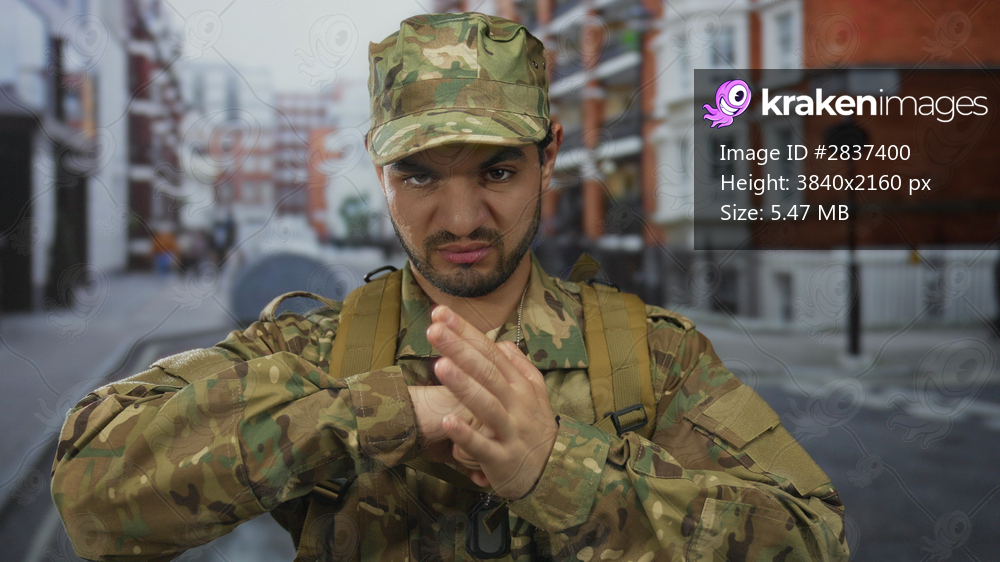 Hispanic man in camouflage uniform slams a fist with stern gaze on a busy city street; duty determination.