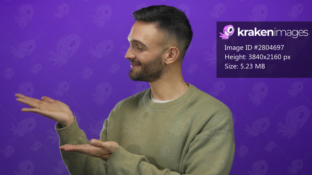 Hispanic man in casual clothing smiles while presenting with his hands against a vibrant purple background, conveying positivity and engagement.