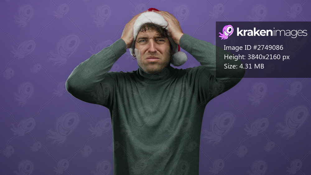 Hispanic man in christmas hat holds head with frustrated expression against purple background representing holiday stress and seasonal emotions