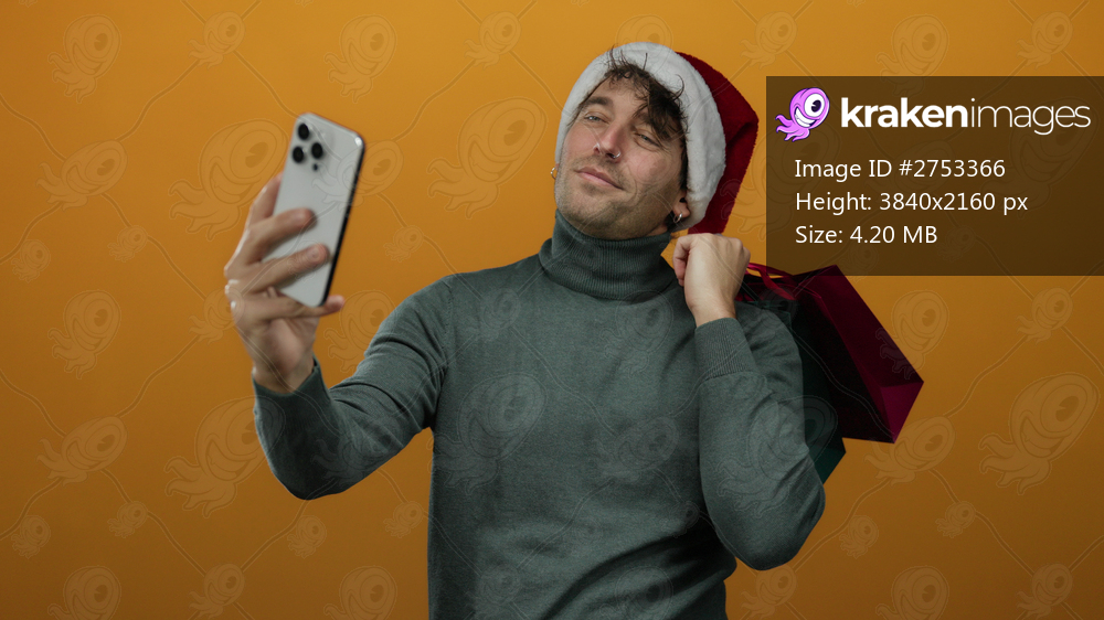Hispanic man in christmas hat taking selfie with smartphone while holding shopping bags against an orange background.