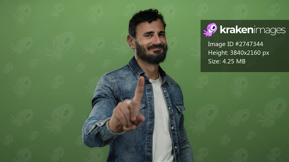 Hispanic man in denim shirt with beard making no gesture with finger against green background.