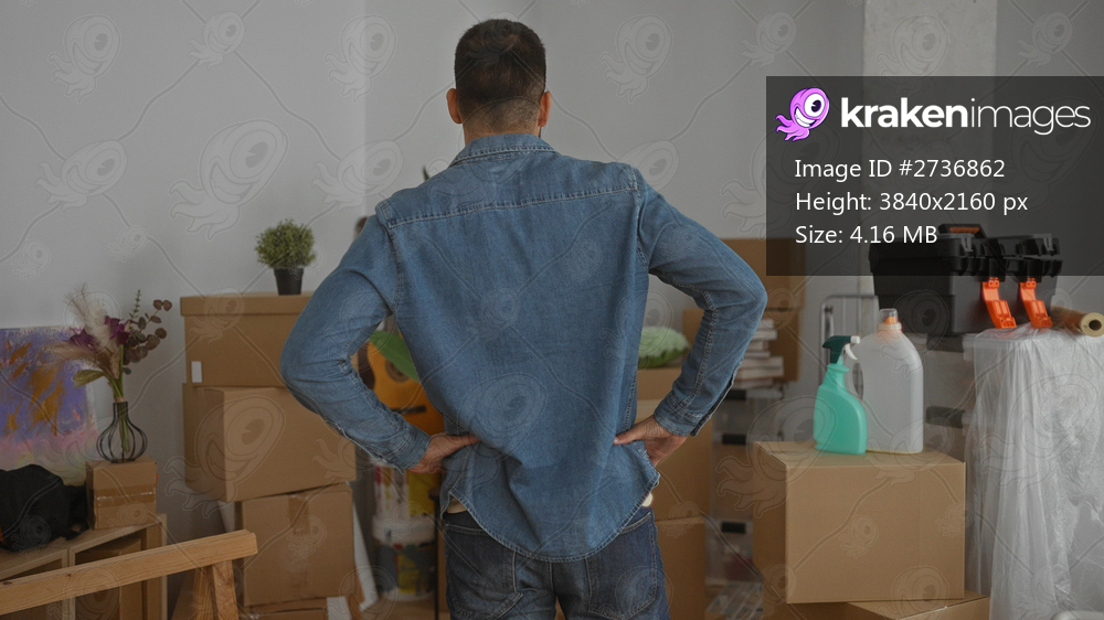 Hispanic man in denim shirt stands amidst moving boxes in an apartment living room, contemplating his new home surrounded by plants and tools.