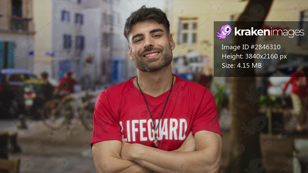 Hispanic man in lifeguard shirt stands with arms crossed and smiles on city street; confidence duty.