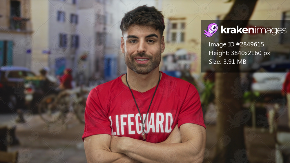 Hispanic man in lifeguard shirt stands with arms crossed and smiles on city street; confidence duty.