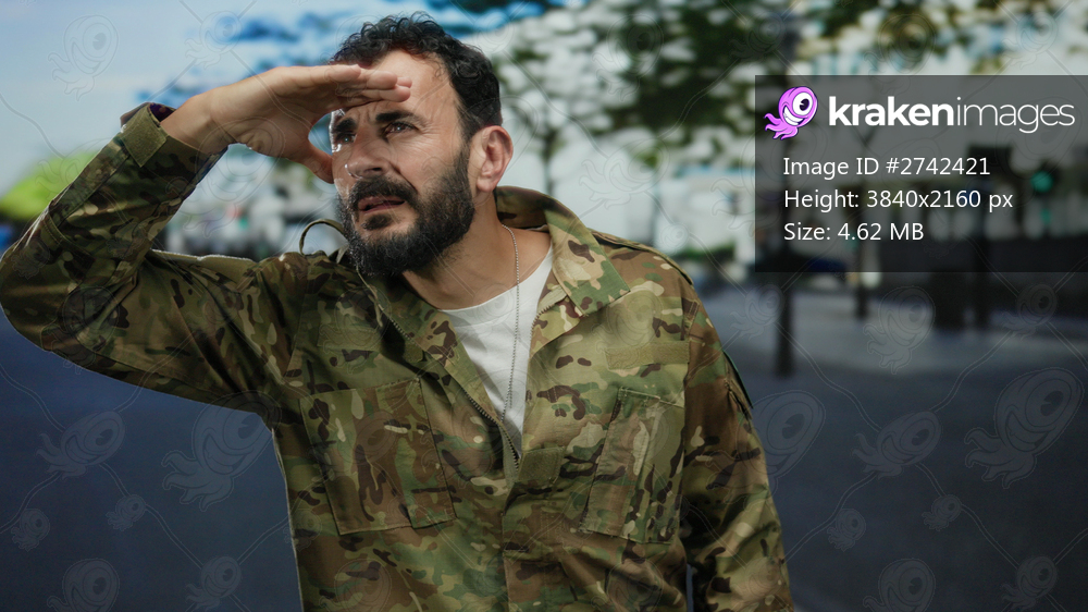 Hispanic man in military uniform with a beard looks into the distance on a city street outdoors under a clear blue sky, blending urban scenery with a sense of search and vigilance. - Kraken Images