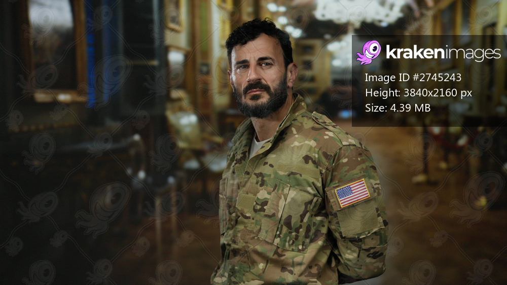 Hispanic man in military uniform with beard stands confidently in art gallery exhibiting cultural paintings and sculptures against a sophisticated museum backdrop. - Kraken Images