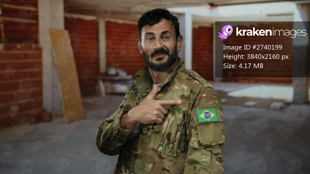 Hispanic man in military uniform with brazilian flag in a construction site, pointing at his shoulder, surrounded by unfinished brick walls, exuding confidence and focus. - Kraken Images