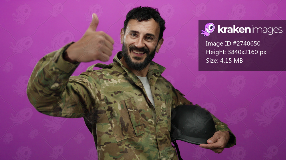 Hispanic man in military uniform giving a thumbs-up while holding a helmet against a vibrant pink background, conveying positivity and readiness.