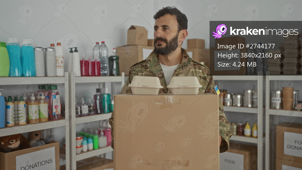 Hispanic man in military uniform holds box in indoor volunteer donation room with shelves of supplies and food containers.