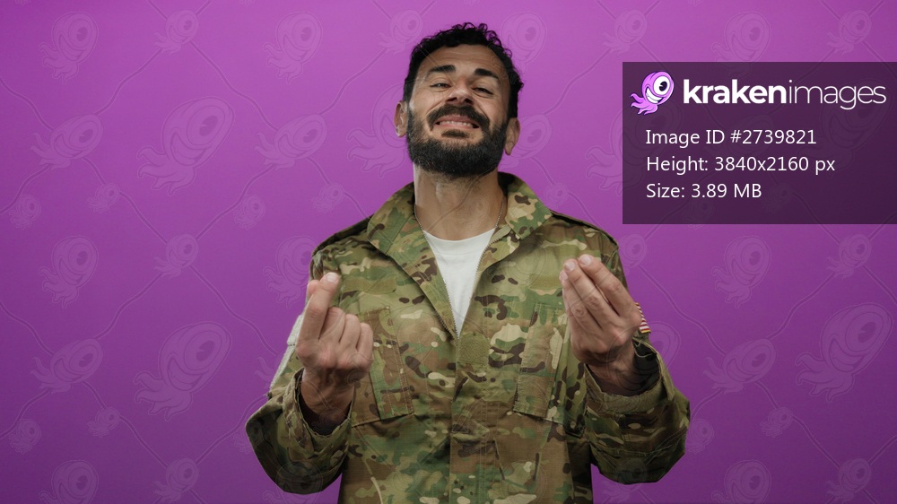 Hispanic man in military uniform makes money gesture with both hands against a vibrant pink background.