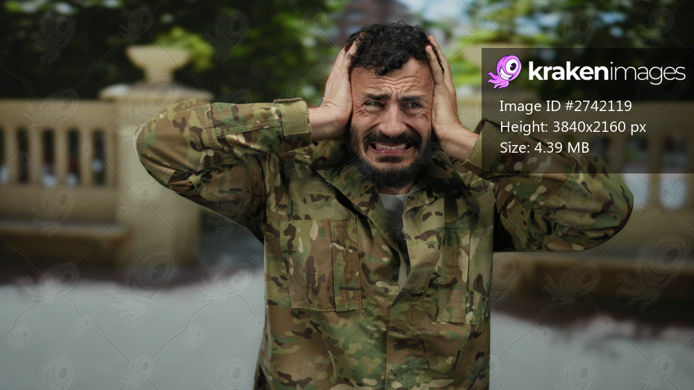 Hispanic man in military uniform on street outdoors expressing distress by holding head in hands against blurred urban background.