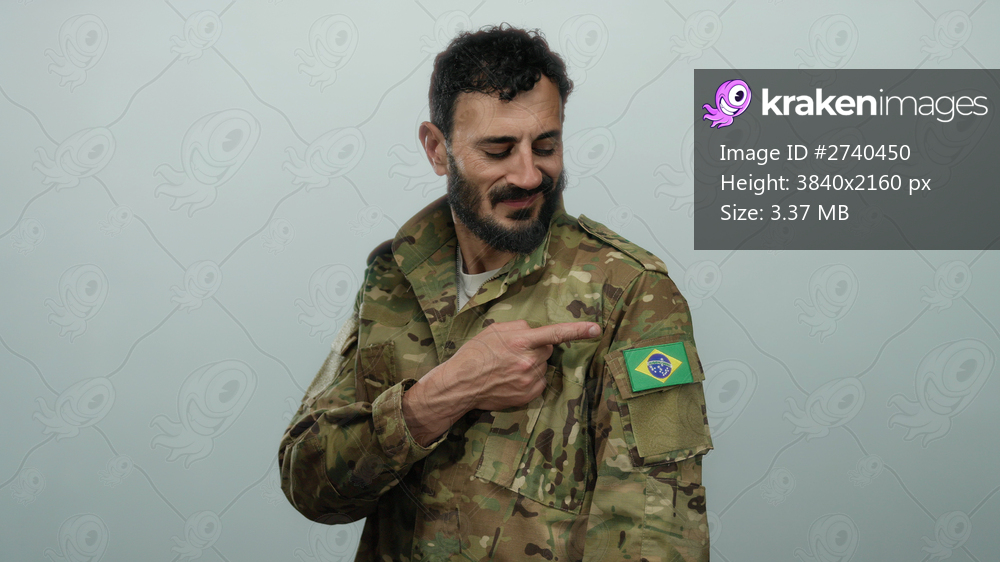 Hispanic man in military uniform points to brazilian flag patch on his sleeve, standing against a grey background with a proud expression and a beard.