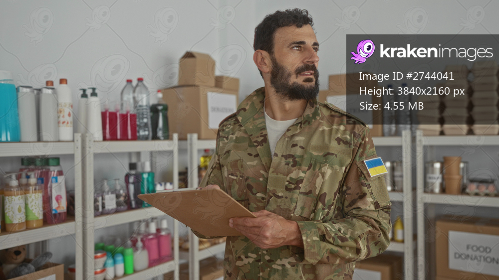 Hispanic man in military uniform stands indoors in a volunteer setting taking notes.
