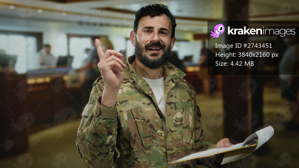Hispanic man in military uniform writing in hotel indoor setting, surrounded by people at the reception counter with a focused expression.