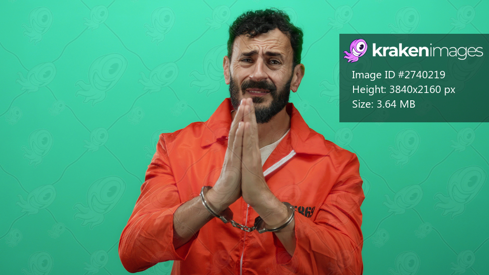 Hispanic man in orange jumpsuit with beard and handcuffs standing against green background showing emotional expression.