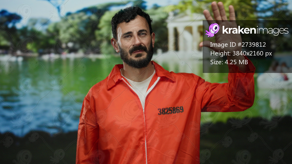 Hispanic man in orange jumpsuit with beard raising hand outdoors in a green park setting with trees visible.