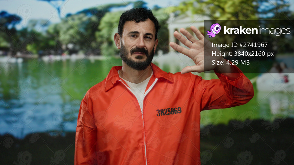 Hispanic man in orange jumpsuit with beard raising hand outdoors in a green park setting with trees visible.