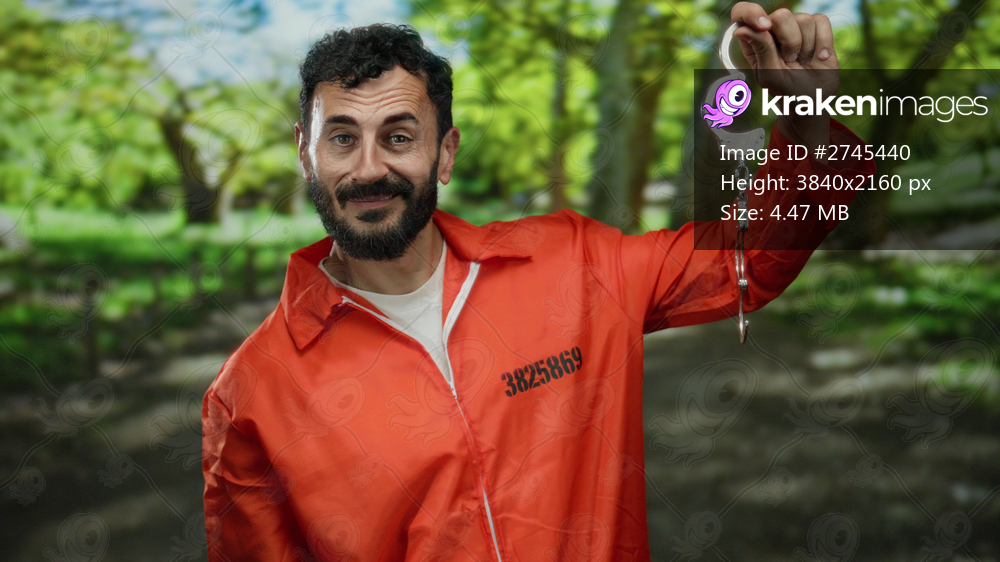 Hispanic man in orange jumpsuit holding handcuffs smiling in a lush green park with trees outdoors, showcasing a contrasting blend of confinement and freedom. - Kraken Images
